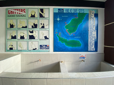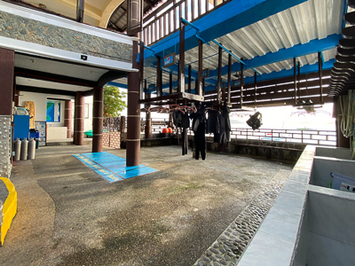 Crystal Blue's dive locker is second to none. The pebble stone dive deck over looks the clear blue waters where the nearby islands can be seen or our stunning sunsets can be viewed. The dive deck is covered to protect you and your gear from the intense tropical sunshine. The deck is organized by a hanging rack system to ensure that your gear is dry before you fly and can accommodate large groups in an organized fashion. Large rinse tanks for dive gear, showers, and separate camera rinse tanks all help to move things along quickly and efficiently.
